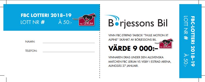 Börjessons Bil skänker en Thule Motion XT Alpine värd ca 9000 kr som vi under kommande helgers matcharrangemang säljer lotter till. När FBC Lerum tar emot Visby i Estrad den 27:e januari avslutas försäljningen och vinnaren dras. Lottpriset är bara 50 kr så du kan öka dina chanser genom att köpa några stycken. Takboxen, som kommer att ha dekaler med Börjessons Bil och FBC på, kommer att finnas att se och klämma på under kommande helger i Rydsberg och Estrad.