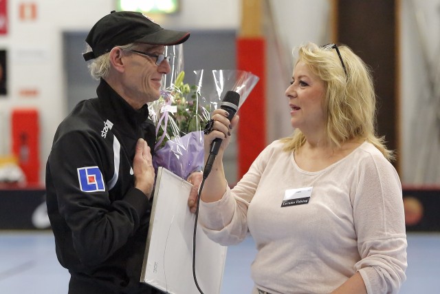 I första pausen var det dags för en av de mest engagerade idrottsledarna i Lerum de senaste decennierna att äntra planen. En rörd Magnus T Carlsson fick då äntligen den utnämning som han är så väl värd. Maiwi Larsson och Peter Welling överlämnade en jättebukett och diplom till Magnus som själv tyckte att det var en stor ära att få den utmärkelse som är den finaste en ungdomsledare kan få i vår kommun. Magnus är ju den viktigaste personen bakom vår Bagheera innebandyskola som bl a kröntes när hela hans knattegäng fick äntra Mässhallen i samband med VM i Göteborg för ett år sedan. Utöver det så har ju Magnus varit vår ordförande i många år och gör även ett oerhört stort jobb i samband med våra matcharrangemang som eventpersonal.
