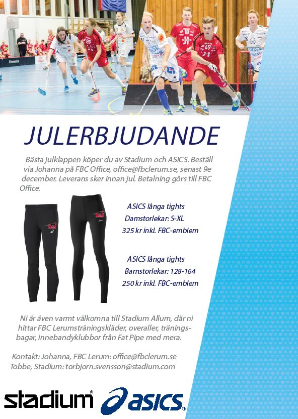 Missa inte den perfekta FBC-julklappen! nov 26, 2015 715 Årets FBC-julklapp! Det finns nu möjlighet att beställa dessa FBC-brandade tights som är framtagna av Stadium och Asics. Perfekt julklapp till både stora och små! Välkomna in med er beställning till Johanna på office@fbclerum.se!
