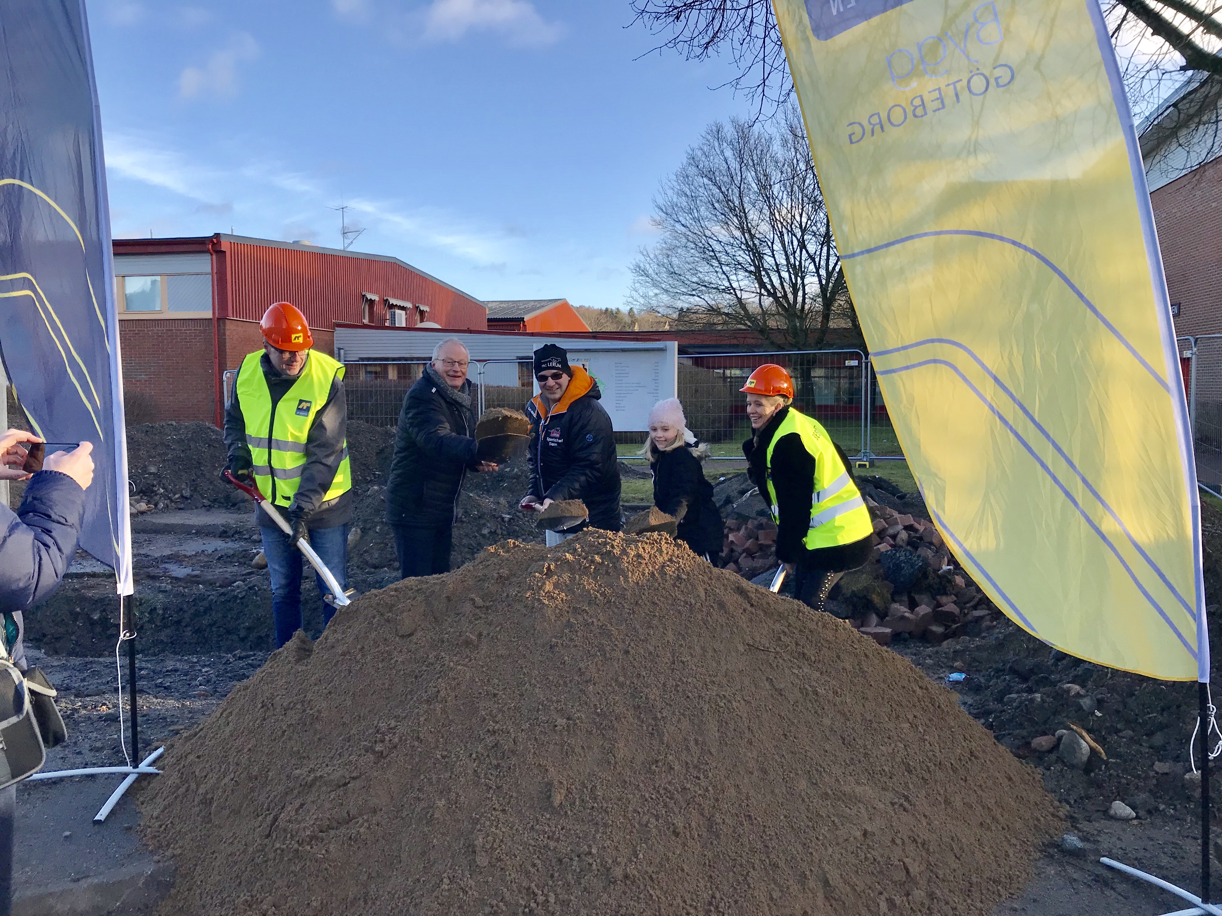 På bilden gräver Dennis Jeryd och Eva Andersson från kommunstyrelsen tillsammans med Mats Lomander, Daniel Axell och Alice Engström från FBC Lerum ett spadtag tillsammans!